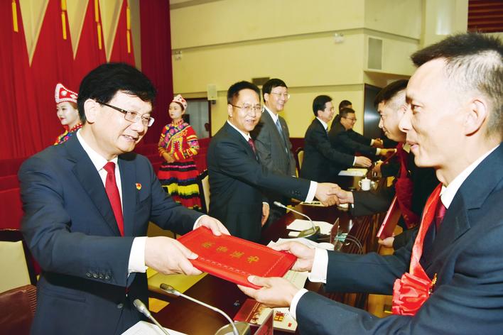 州委书记杨斌,州委副书记、州政府党组书记张文旺等领导为受表彰的先进代表颁发荣誉证书。 (王 洪 摄)