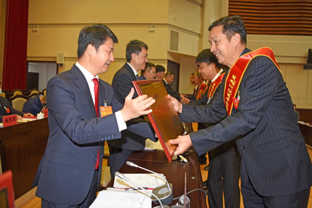 州委书记刘勇为获得第六届楚雄州优秀中国特色社会主义事业建设者荣誉的个人颁发荣誉牌。