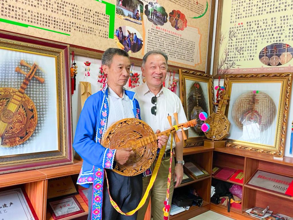 著名“三农”问题专家温铁军与省级非遗文化传承人李树明交流镇南月琴制作工艺。