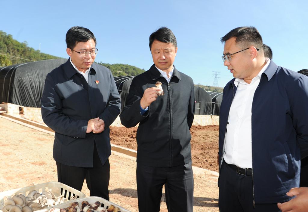 州委书记刘勇在南华县沙桥镇田心村委会楚雄辛巴汉生物科技有限公司食用菌种植基地调研。
