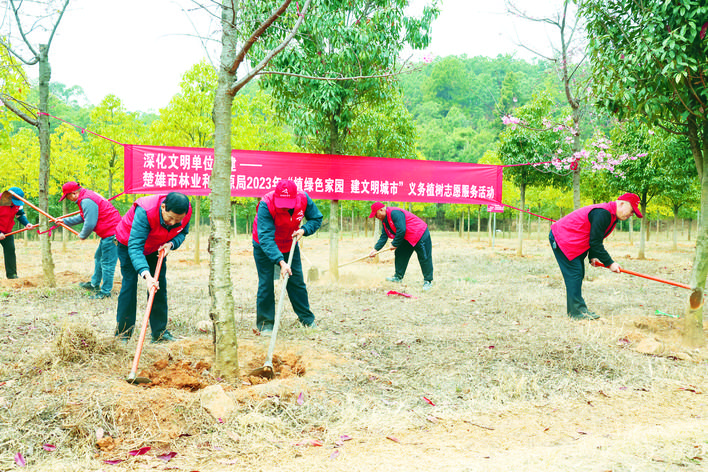 在桃源湖广场,工作人员向楚雄市民发放森林防火、全民义务植树等相关宣传资料,普及“互联网+义务植树”参与方法,动员广大群众积极参与城市植树造林,为家园添新绿。在赵家湾全民义务植树基地,州、市绿化委员会60余名干部职工为树木开展松土、浇水等管护活动。
