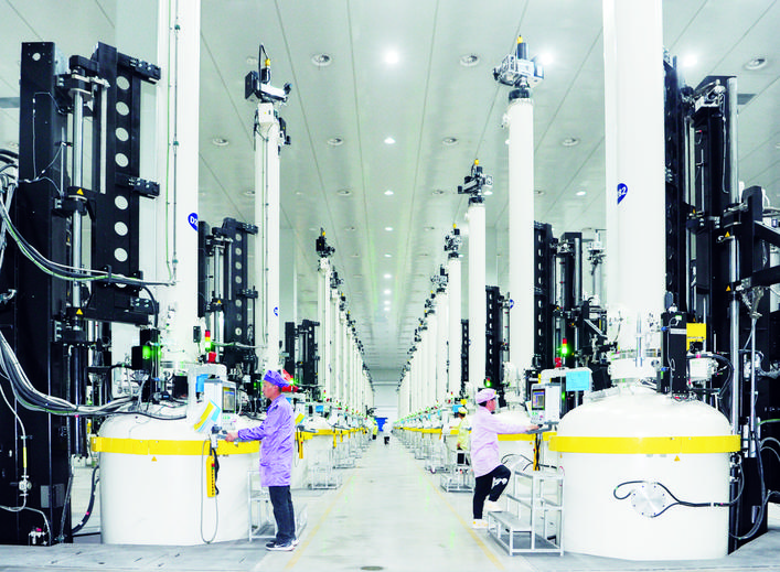 宇泽半导体(云南)有限公司是一家以生产单晶硅棒、硅片为主,集研发、生产、销售、服务于一体的技术创新型企业,公司一期3GW单晶硅拉棒项目实现了当年签约、当年建设、当年投产,创造了180天内从签约到点火试机的“楚雄速度”。图为宇泽半导体(云南)有限公司生产车间。