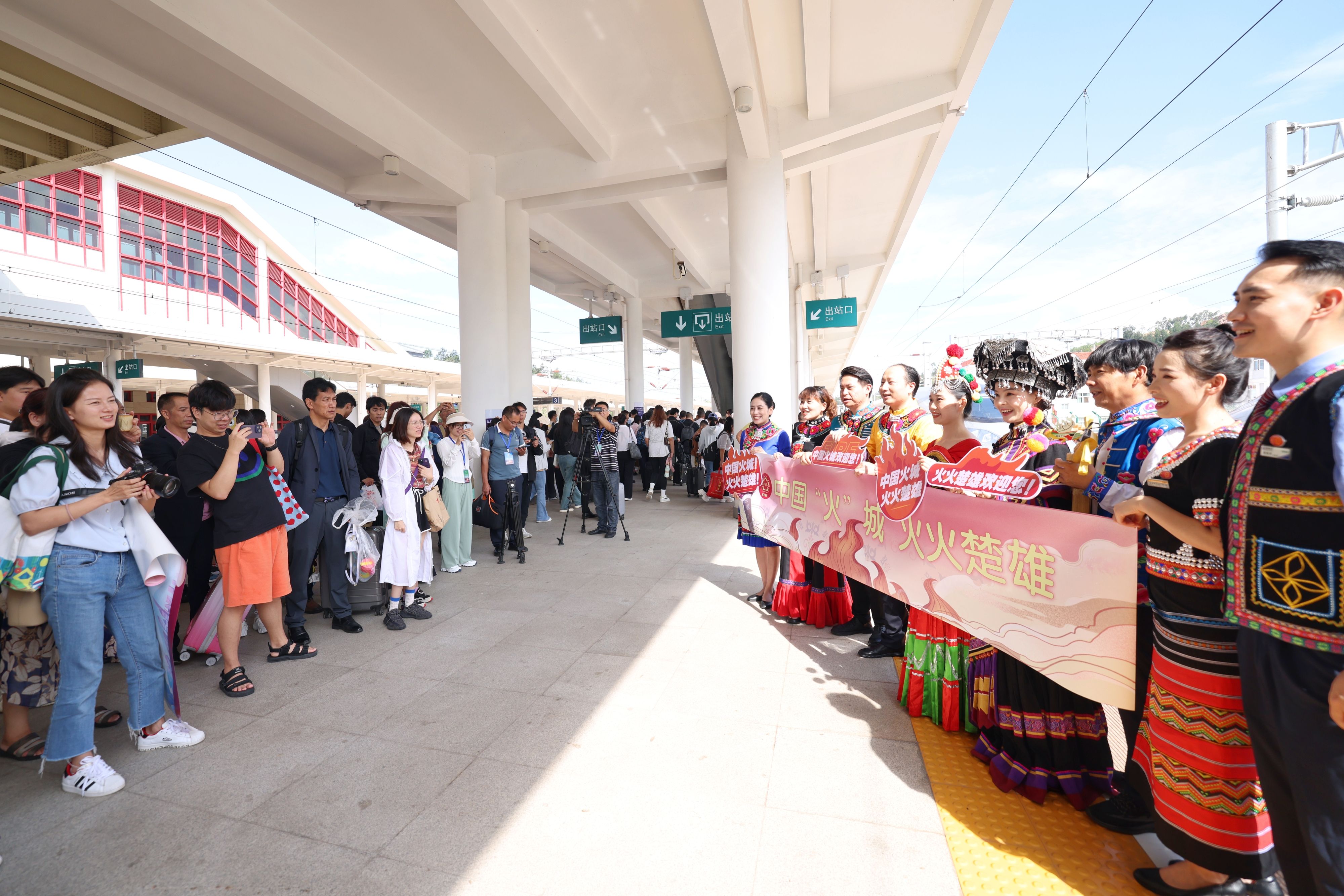 在楚雄站出站口,彝家儿女穿着盛装,唱响彝家调,跳起左脚舞,载歌载舞迎接来自国内外的游客,欢迎四海宾朋来“中国火城·火火楚雄”游玩做客,一起感受“火”的民族、“火”的激情,体验丰富多彩的节庆活动。