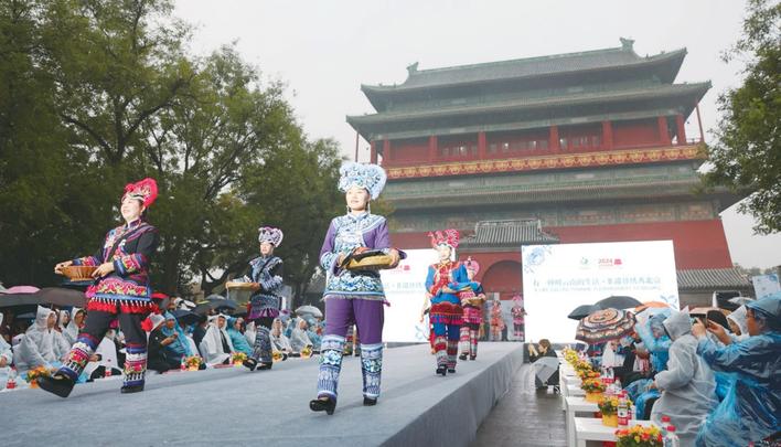 10月13日,“有一种叫云南的生活·非遗彝绣秀北京”活动在世界遗产名录北京钟鼓楼举行。(记者 王 洪 摄)
