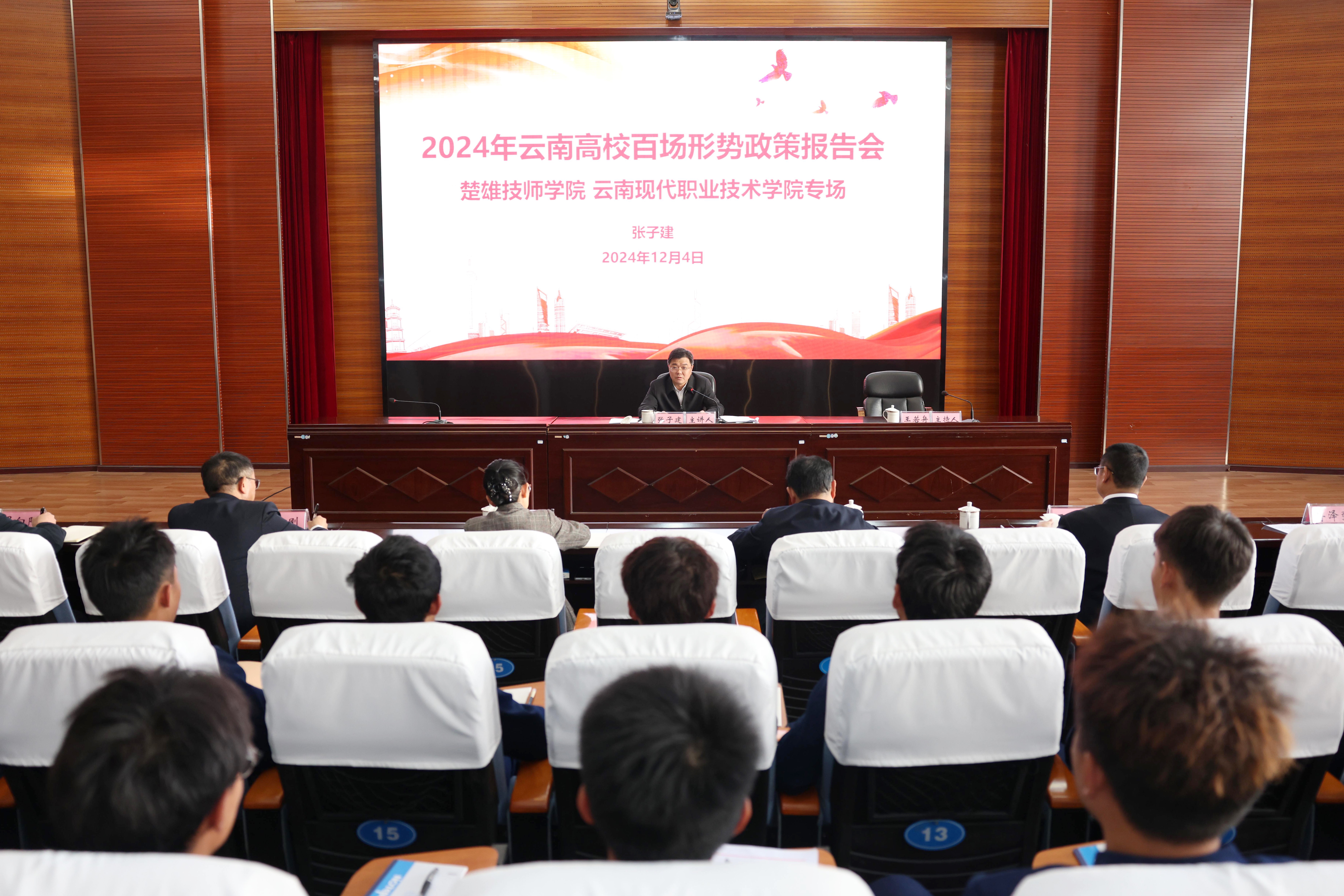 12月4日下午,州委书记张子建到楚雄技师学院 云南现代职业技术学院作形势政策报告时强调,要以习近平新时代中国特色社会主义思想为指导,深入学习贯彻党的二十届三中全会以及全国、全省、全州教育大会精神,全面贯彻党的教育方针,推进职业教育高质量发展,培育“工匠精神”、打造“工匠摇篮”,努力培养担当民族复兴大任的时代新人。该校师生代表到会聆听了报告。