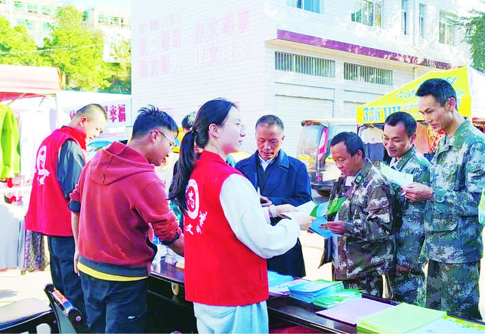 每逢赶集日,大地基乡干部通过摆摊设点这种最直接的方式,为群众解读政策、办理业务,其中包含宣传食品安全、保障妇女儿童权益、森林防火等政策解读以及医保养保缴费、社会救助等业务。