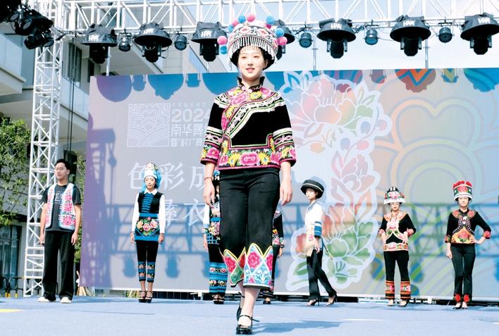 文化周期间,还设立了彝绣青年艺术集市,独具南华特色的“绣舞南华”群众文化广场舞和“村T”彝绣品牌专场秀轮番上演,为国庆期间到南华游玩的旅客送上一份彝绣元素满满的非遗大餐。