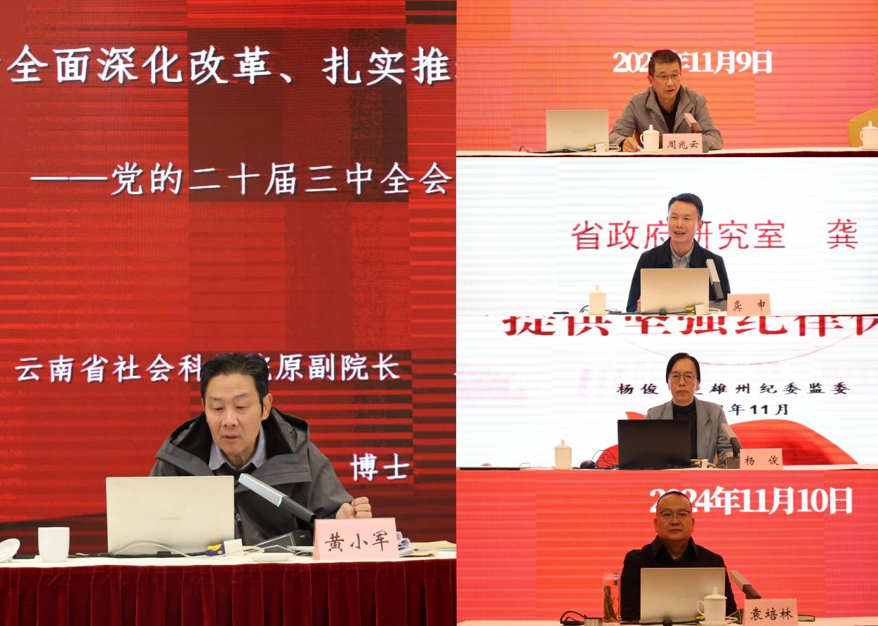 此次培训班共设5个专题,邀请了法学博士、云南省马克思主义理论研究学科带头人黄小军作党的二十届三中全会精神解读;邀请省政府办公厅、省政府研究室有关处室领导,聚焦办公室系统工作主责主业,围绕政务督查、以文辅政等办公室重点工作进行辅导;邀请州纪委监委、州发展改革委有关领导联系楚雄州政府系统工作实际,进行党风廉政建设和学习贯彻党的二十届三中全会精神、持续推动楚雄州高质量跨越式发展专题辅导。