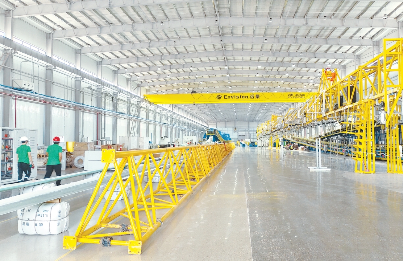 图为云甸工业园区远景年产10GW风机叶片项目工厂车间。