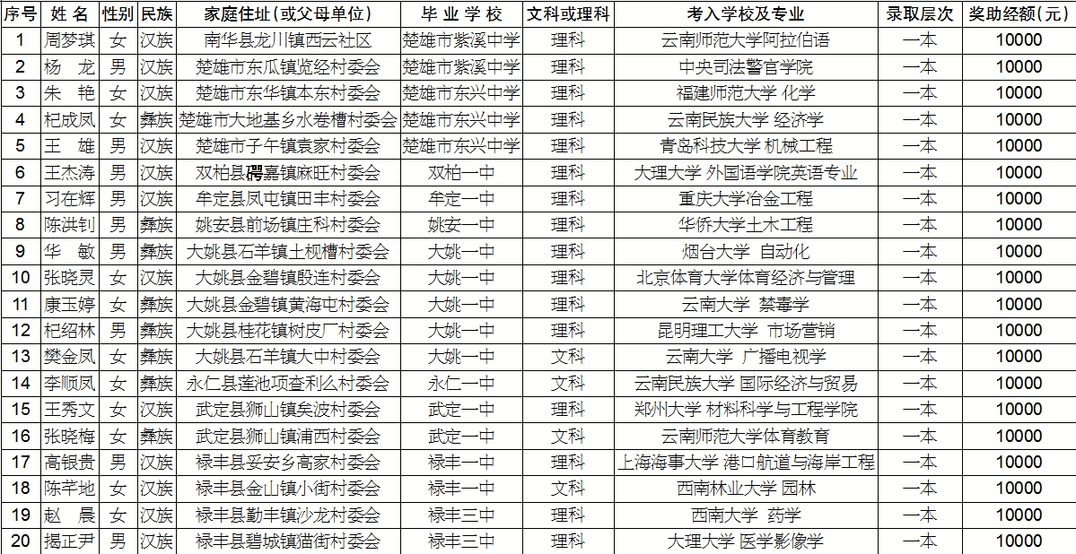 云南爱尔发生物技术股份有限公司心系彝州寒门学子,自2013年以来,每年无偿捐赠20万元,设立“云南爱尔发奖助学金”,对我州当年考取重点大学的20名优秀贫困大学生进行奖助。根据《云南爱尔发奖助学金管理使用办法》,经爱尔发奖助学金管理使用委员会审定,现对第五届(2017/2018学年)云南爱尔发奖助学金拟奖助的20名优秀贫困大学生进行公示,接受社会监督。自公告发布之日7天内,若对公告事项有异议,请将意见或建议反馈给云南爱尔发奖助学金管理使用委员会办公室。若无异议,将于2018年2月9日下午1点在云南爱尔发生物技术股份有限公司(楚雄市子午镇)举行集中发放仪式。请第四届、第五届受奖助学生本人持有效证件(居民身份证、学生证、大学学习生活情况报告),于2018年2月9日上午9点前到楚雄州教育局(楚雄市鹿城西路147号)二楼会议室集中。同时,诚邀往届受奖助同学参加仪式。