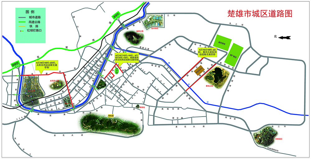 为认真做好楚雄彝族自治州建州60周年系列庆祝活动期间的道路交通管理工作,保障楚雄市城区道路交通安全畅通、文明有序,确保各项庆祝活动顺利举行,依据《中华人民共和国道路交通安全法》及相关规定,决定对楚雄市城区部分道路实施交通管制。现通告如下: