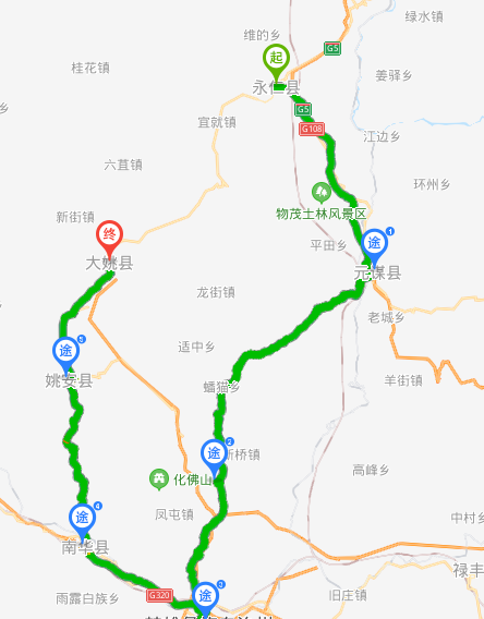 二、车辆绕行线路 (一)攀枝花、永仁等前往大姚方向的车辆,从G5京昆高速或G108线至元谋经S218元楚线(原元双公路)至楚雄、南华、姚安至大姚。 (二)大姚前往永仁方向的车辆,从大姚至楚雄经S218元楚线(原元双公路)至牟定、元谋至永仁。