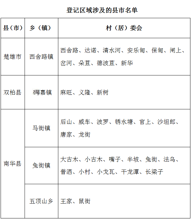 本次登记区域涉及楚雄彝族自治州3个县(市)5个乡(镇)34个村(居)民委员会(具体见附录)。