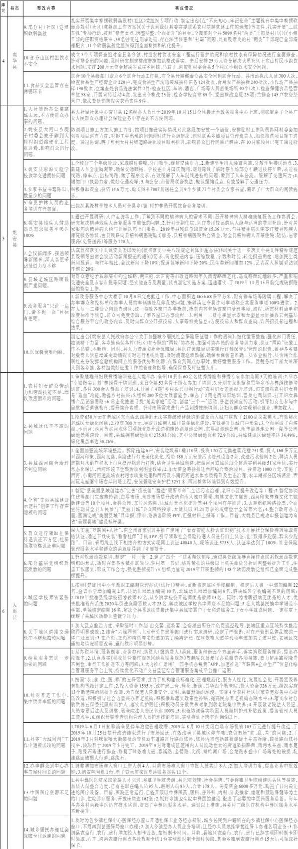 全州“不忘初心、牢记使命”主题教育开展以来,我州各级各部门认真贯彻落实习近平总书记关于“注重开门抓教育”“注重解决群众最急最忧最盼的紧迫问题”的重要指示,深入推进“问题起底、党员服务、群众满意”工作,聚焦突出问题抓好整改落实,着力解决群众最急最忧最盼的紧迫问题取得了明显成效。为确保主题教育取得最好成效,让群众切实感受到主题教育带来的新变化新成效,实现“为民服务解难题”的目标,现将第四批(县市)立行立改事项整改落实情况予以公布,接受群众监督。
