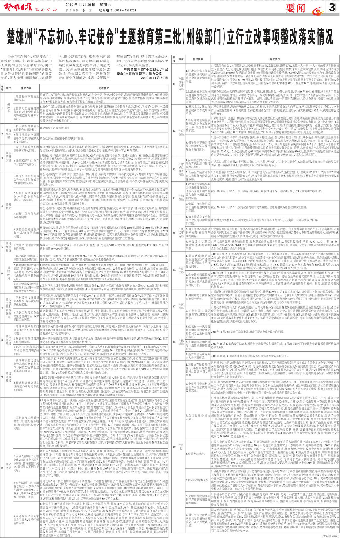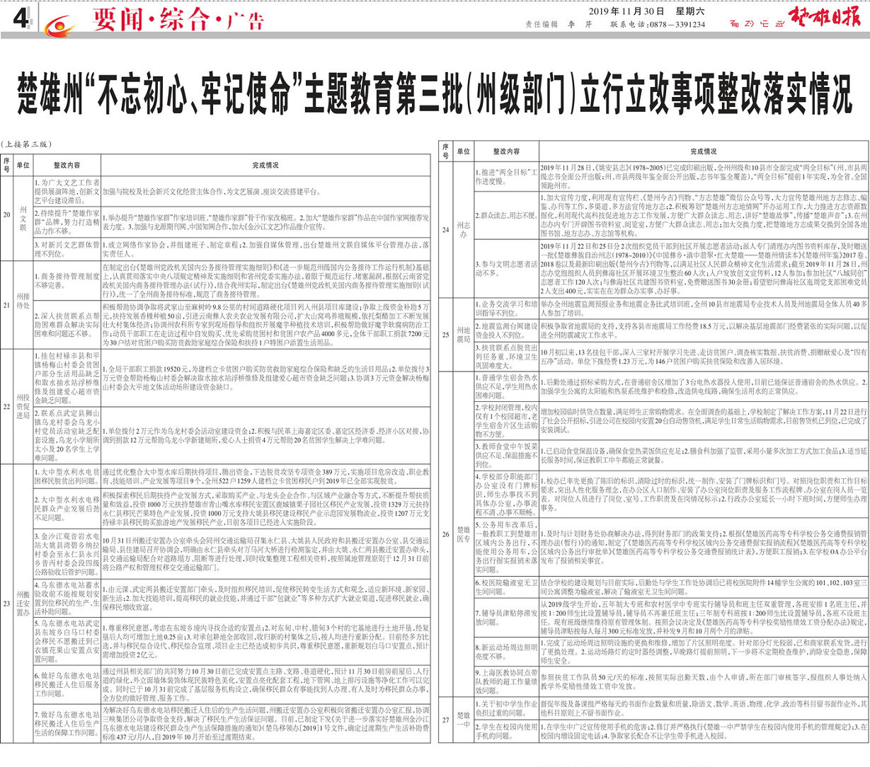 全州“不忘初心、牢记使命”主题教育开展以来,我州各级各部门认真贯彻落实习近平总书记关于“注重开门抓教育”“注重解决群众最急最忧最盼的紧迫问题”的重要指示,深入推进“问题起底、党员服务、群众满意”工作,聚焦突出问题抓好整改落实,着力解决群众最急最忧最盼的紧迫问题取得了明显成效。为确保主题教育取得最好成效,让群众切实感受到主题教育带来的新变化新成效,实现“为民服务解难题”的目标,现将第三批州级各部门立行立改事项整改落实情况予以公布,接受群众监督。