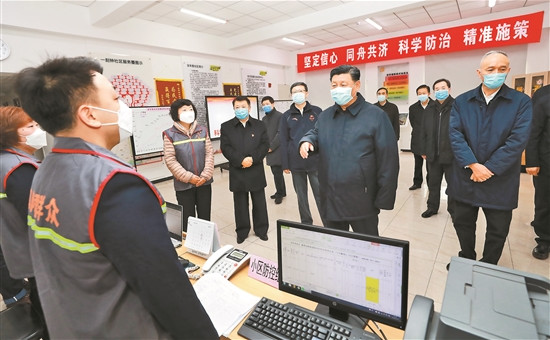 2月10日,中共中央总书记、国家主席、中央军委主席习近平在北京调研指导新冠肺炎疫情防控工作。这是习近平在朝阳区安贞街道安华里社区,了解基层一线疫情联防联控情况。