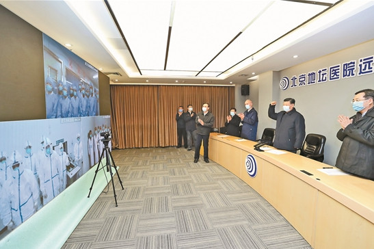 习近平十分牵挂湖北和武汉的疫情。在地坛医院远程诊疗中心,习近平通过视频连线武汉市收治新冠肺炎患者的金银潭医院、协和医院、火神山医院,向疫情防控一线的医务工作者、干部职工和人民解放军指战员了解情况、听取意见和建议。他强调,全国广大医务工作者不忘初心、牢记使命,响应党的号召,义无反顾冲上疫情防控第一线,同时间赛跑,与病魔较量,顽强拼搏、日夜奋战,展现了对党、对人民高度负责的精神面貌。他指出,现在疫情防控正处于胶着对垒状态,广大医务工作者一定要坚持下去,发扬特别能吃苦、特别能战斗的精神,发挥火线上的中流砥柱作用,始终把人民群众生命安全和身体健康放在首位,全力以赴救治患者,打好武汉保卫战、湖北保卫战。