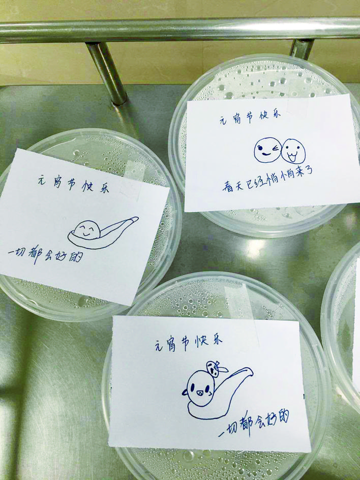 然而,这一碗碗看似平常的元宵却感动了现场的无数人。因为在每碗元宵的餐盒盖上,不仅写有“元宵节快乐”“一切都会好的”“春天已经悄悄来了”等祝福和励志的话语,还配上了可爱、呆萌的卡通简笔画。原来,这是州人民医院感染性疾病科护士武显柳的有意之作。