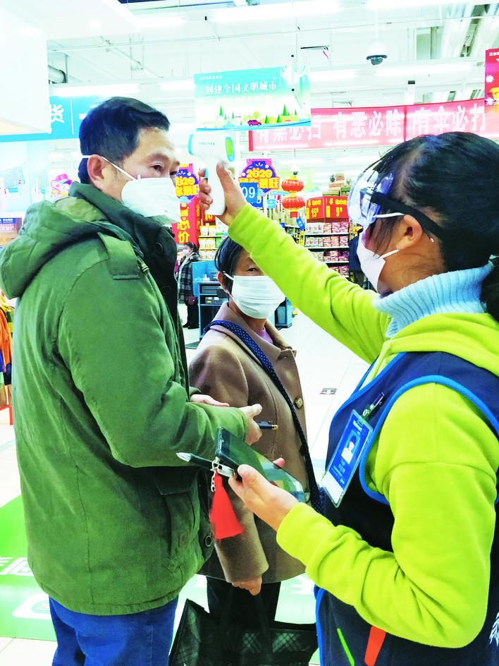超市工作人员为前来购物的顾客测量体温。 (记者 夏天彧摄)