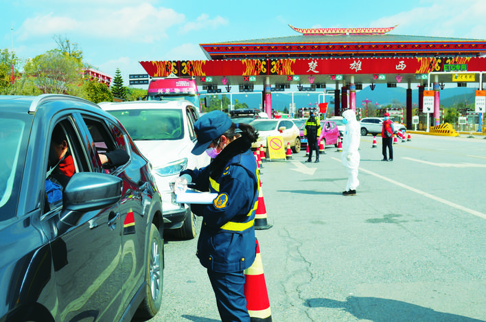 为严格做好外来车辆入境管控,全州在省界、州界、国省干线等重要地段设置防控检查点,对入楚车辆人员一律进行信息登记和现场体温监测。在楚大高速、永武高速、320 国道、108 国道、227 国道、永景线、安武县、楚广高速联络线、楚雄市城区威楚大道等重点路段设置的多个防控检查点上,安排各级卫健、路政运政、公安交警等部门的工作人员联合参与疫情防控工作。“你好!为防止疫情的传播,也为了你和家人的安全,请配合我们进行信息登记和体温监测工作。”这是记者在楚雄西收费站看到的一幕,工作人员正在为驾乘人员测量体温,并认真询问记录相关信息。