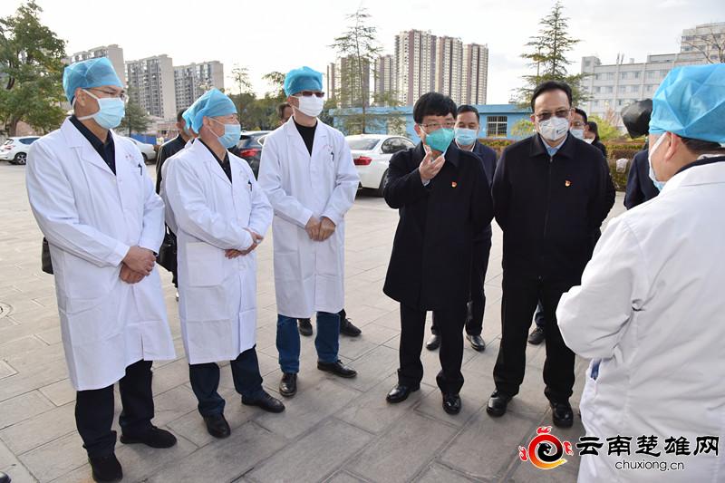 州委书记杨斌,州委副书记、州长迟中华率队在楚雄州人民医院实地检查疫情防控工作并慰问一线医务工作者。(记者王洪摄)