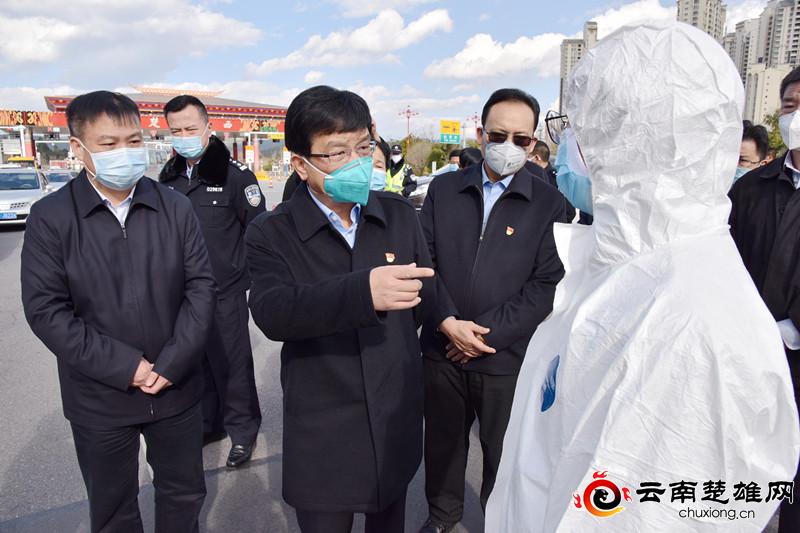 州委书记杨斌,州委副书记、州长迟中华率队在楚雄西收费站实地检查疫情防控工作。(记者王洪摄)