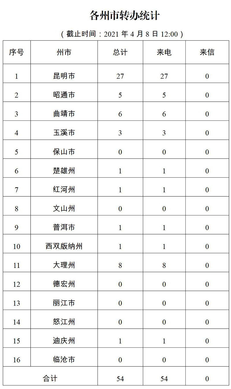 截至4月8日,督察组交办群众举报投诉生态环境问题共二批54件,涉及州(市)10个,昆明市27件居第一位;大理州8件居第二位;曲靖市6件居第三位;昭通市5件;玉溪市3件;楚雄州、普洱市、版纳州、迪庆州、红河州各1件;其他州(市)尚未收到举报件。