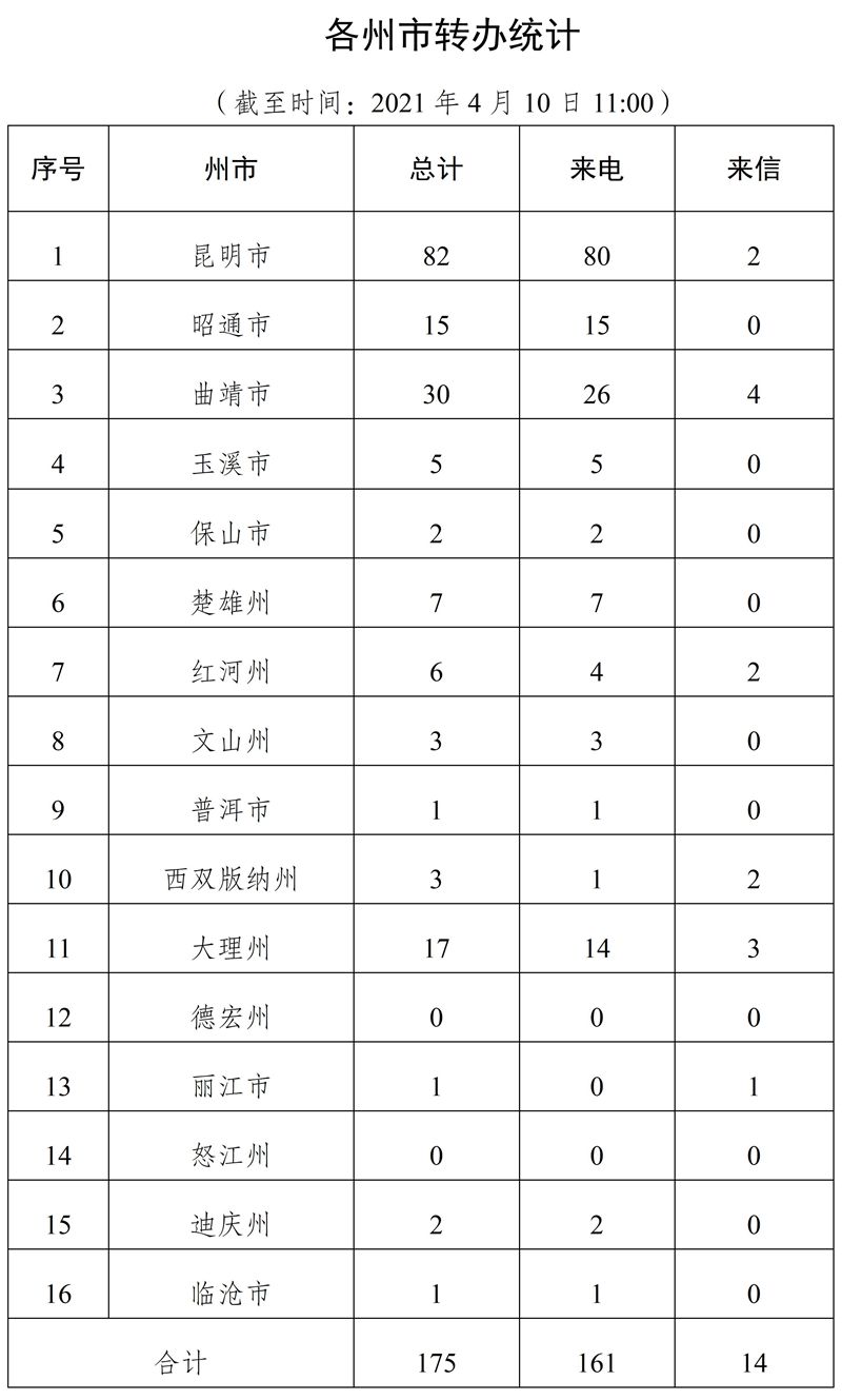 截至4月10日上午11:00,督察组交办群众举报投诉生态环境问题共四批175件(来电161件、来信14件),涉及州(市)14个,昆明市82件,曲靖市30件,大理州17件,昭通市15件,楚雄州7件,红河州6件,玉溪市5件,文山州、西双版纳州各3件,保山市、迪庆州各2件,普洱市、丽江市、临沧市各1件。