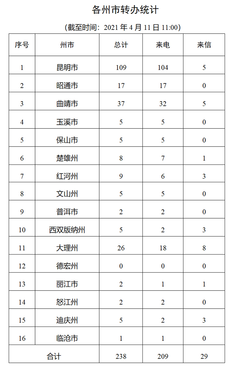 截至4月11日上午11:00,督察组交办群众举报投诉生态环境问题共五批238件(来电209件、来信29件),涉及州(市)15个,昆明市109件,曲靖市37件,大理州26件,昭通市17件,红河州9件,楚雄州8件,玉溪市、保山市、文山州、西双版纳州、迪庆州各5件,普洱市、丽江市、怒江州各2件,临沧市1件。