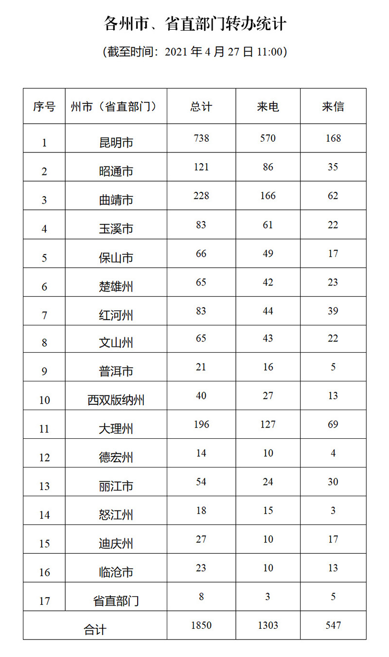 截至4月27日上午11:00,督察组交办群众举报投诉生态环境问题共二十一批1850件(来电1303件、来信547件);其中,昆明市738件,曲靖市228件,大理州196件,昭通市121件,玉溪市83件,红河州83件,保山市66件,楚雄州65件,文山州65件,丽江市54件,西双版纳州40件,迪庆州27件,临沧市23件,普洱市21件,怒江州18件,德宏州14件,省直部门直接办理8件。