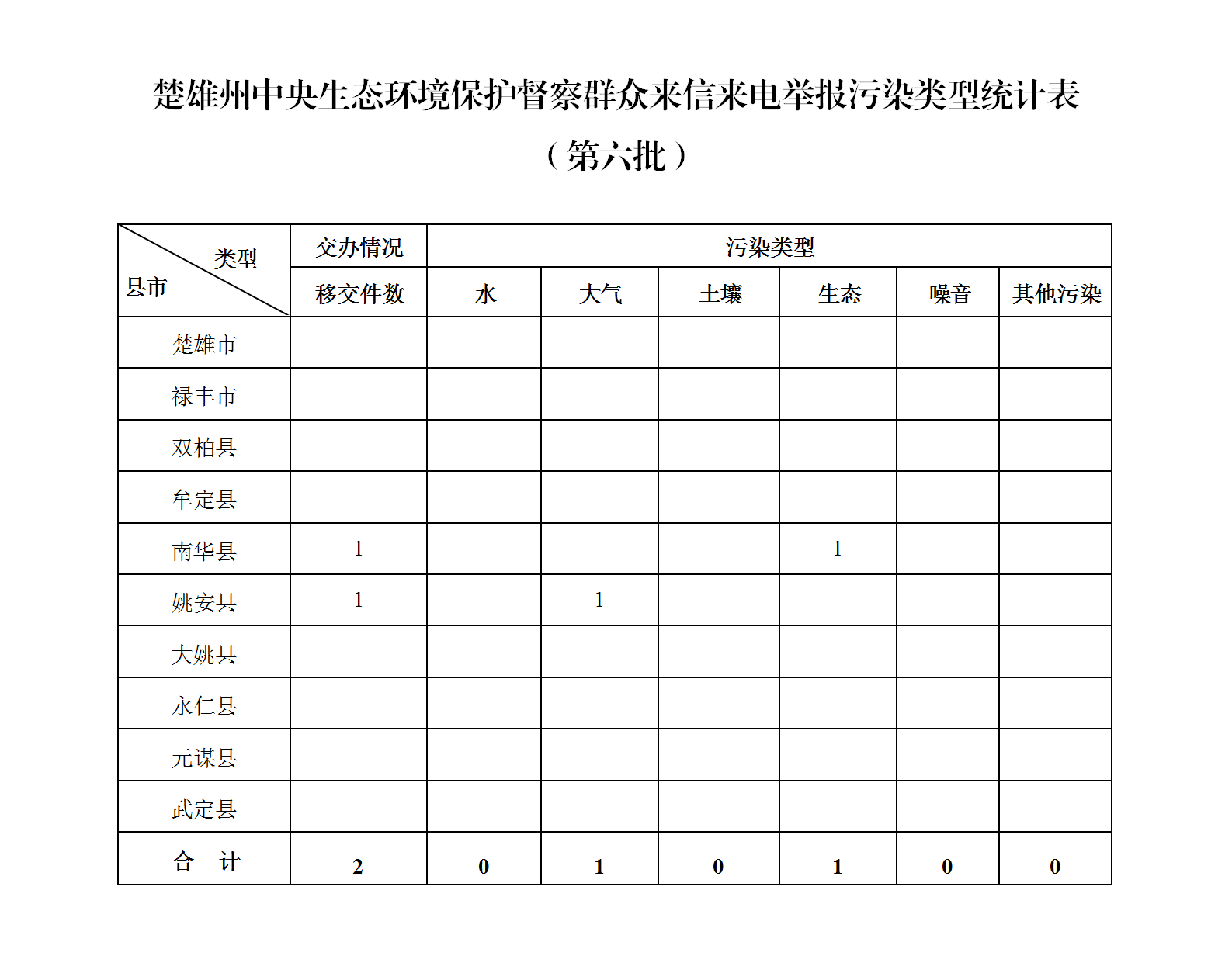 2024年5月15日,中央第七生态环境保护督察组向楚雄州转办第六批群众信访举报件2件。其中:来电2件,来信0件。从信访举报件生态环境问题污染类型来看,涉及生态1件,大气1件。从县市来看,南华县1件,姚安县1件。截至当日,楚雄州已累计收到中央第七生态环境保护督察组转办的信访举报件7件,所有举报件均已及时转交相关县(市)处理。