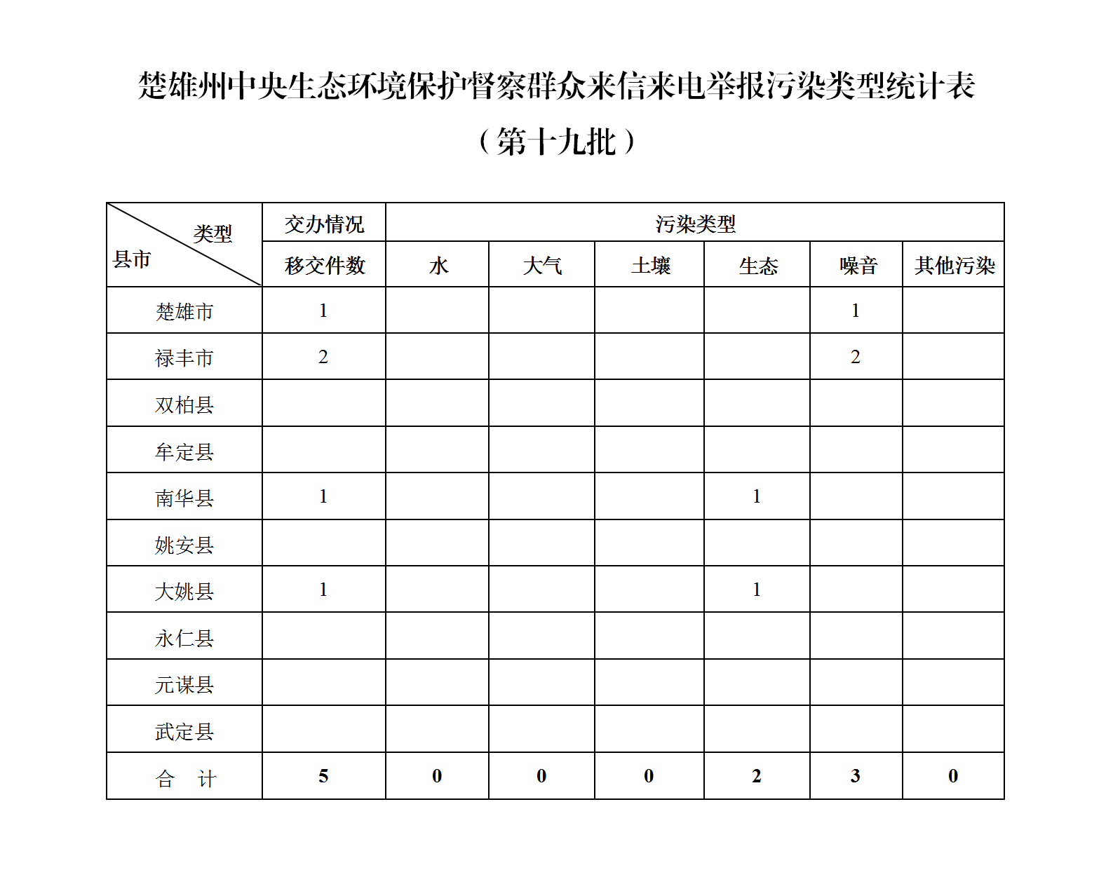 2024年5月28日,中央第七生态环境保护督察组向楚雄州转办第十九批群众信访举报件5件。其中:来电3件,来信2件。从信访举报件生态环境问题污类型来看,涉及生态2件,噪音3件。从县市来看,楚雄市1件,禄丰市2件,南华县1件,大姚县1件。截至当日,楚雄州已累计收到中央第七生态环境保护督察组转办的信访举报件56件,所有举报件均已及时转交相关县(市)处理。