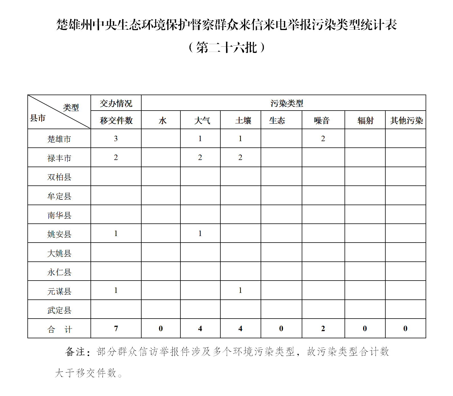 2024年6月4日,中央第七生态环境保护督察组向楚雄州转办第二十六批群众信访举报件7件。其中:来电4件,来信3件。从信访举报件生态环境问题污类型来看,涉及大气4件,土壤4件,噪音2件。从县市来看,楚雄市3件,禄丰市2件,姚安县1件,元谋县1件。截至当日,楚雄州已累计收到中央第七生态环境保护督察组转办的信访举报件90件,所有举报件均已及时转交相关县(市)处理。