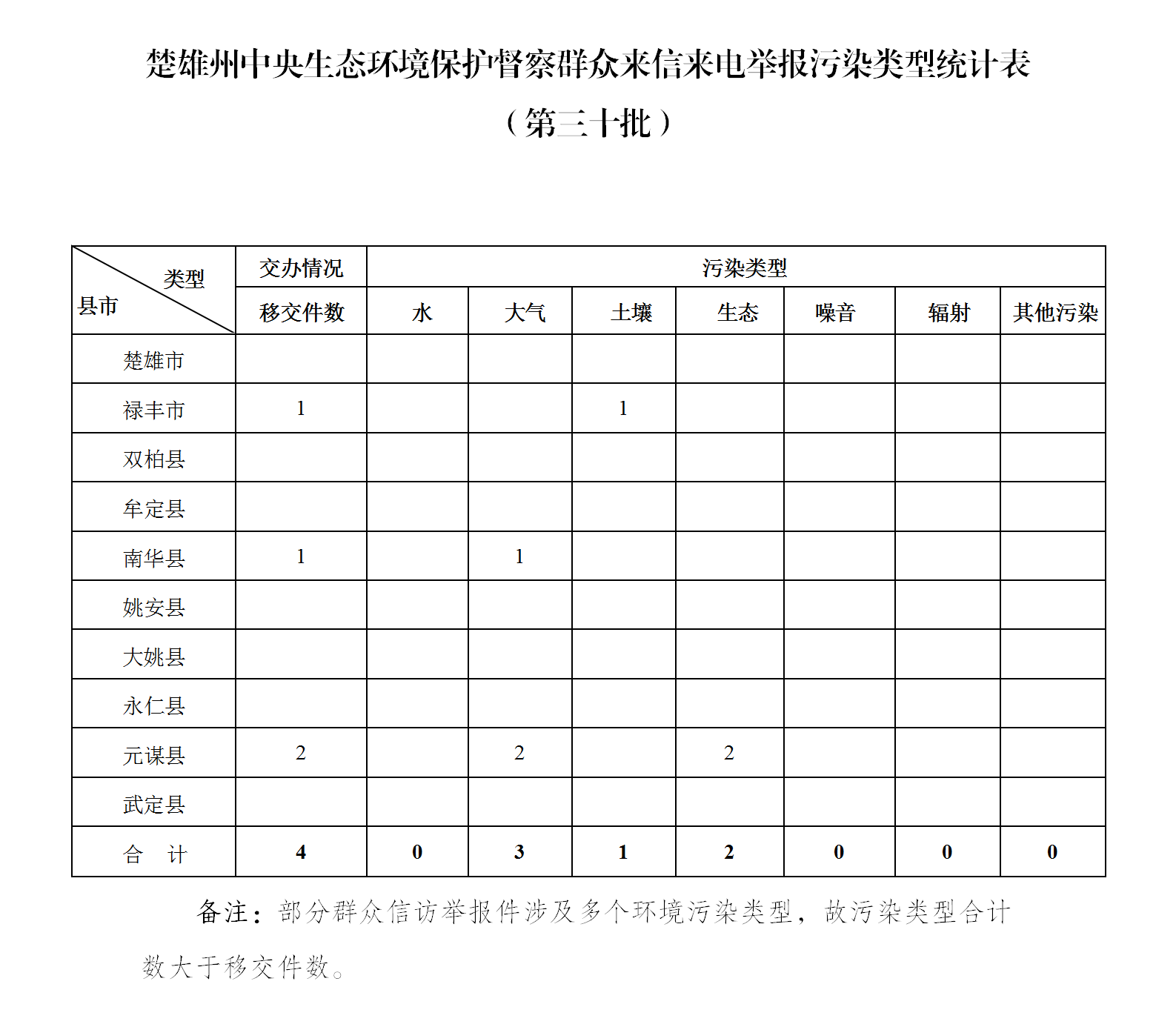 2024年6月8日,中央第七生态环境保护督察组向楚雄州转办第三十批群众信访举报件4件。其中:来电1件,来信3件。从信访举报件生态环境问题污类型来看,涉及大气3件,土壤1件,生态2件。从县市来看,南华县1件,禄丰市1件,元谋县2件。截至当日,楚雄州已累计收到中央第七生态环境保护督察组转办的信访举报件107件,所有举报件均已及时转交相关县(市)处理。
