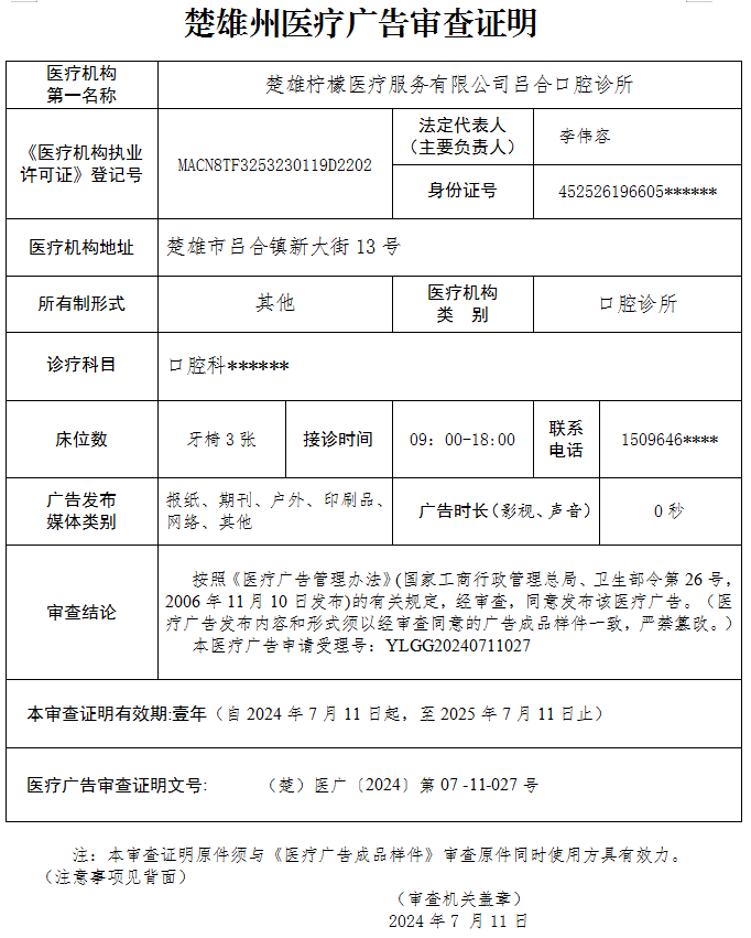 楚雄柠檬医疗服务有限公司吕合口腔诊所——医疗广告审查证明