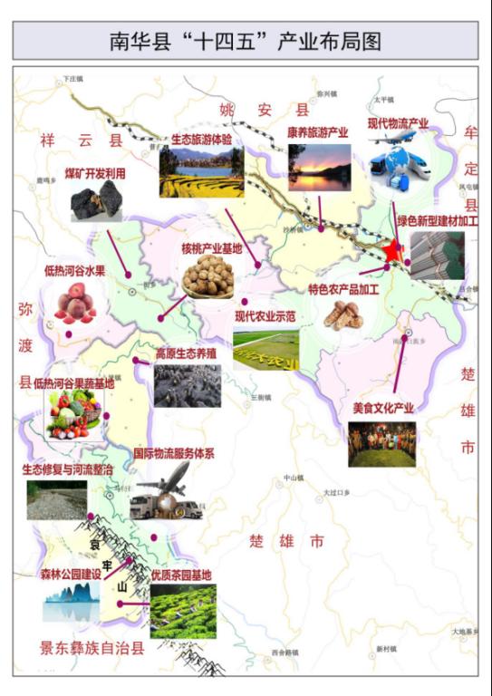 ——产业结构调整实现新突破。全县经济呈现“传统产业转型增长、新兴产业加快增长、新旧动能接续转换”的良好态势。高原特色现代农业实现新提升,累计培育新型农业经营主体2079个、农产品“三品一标”认证19个、省州农业龙头企业39户。被商务部认定为食用菌“国家外贸转型升级基地”、被省人民政府认定为全省“一县一业”野生菌特色县。工业实现新发展,南华特色园区纳入楚雄高新区托管区,加快推进化解煤炭行业过剩产能和煤炭产业转型升级,成为全省保留煤炭产业三州(市)五县(市)之一县。电商物流、餐饮美食、文化旅游等第三产业呈现新活力,腾龙物流荣获云南省民营小巨人企业,乡村物流配送体系建设经验在全省推广,被省商务厅评为“电子商务重点县”。三次产业结构由2015年27.1:31.3:41.6优化为2020年24.3:33.8:41.9,三产融合发展态势持续向好。