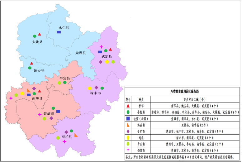 在楚雄、南华、永仁等地建设牛肝菌、松茸、块菌(松露)等野生食用菌产业三产融合基地。