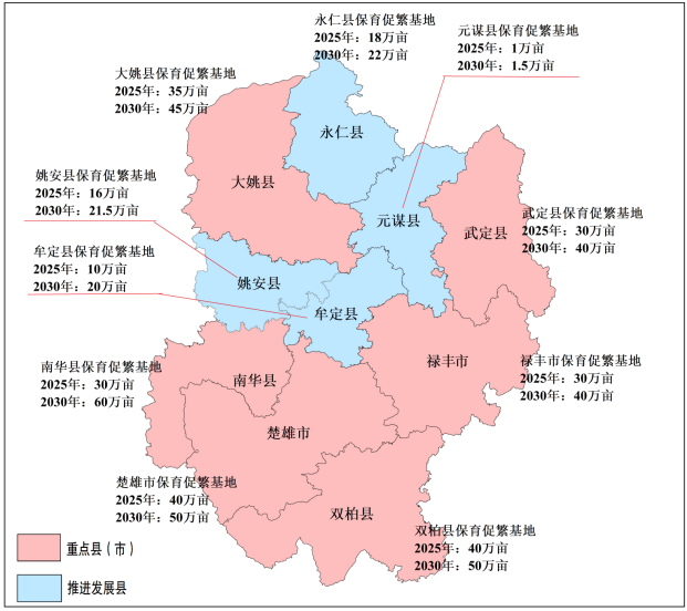 保育促繁示范成效显著。自2016年以来,全州积极推广野生食用菌保育促繁技术,对野生食用菌集中分布区域,实施承包经营和集约经营,实行科学采集,有效提高野生食用菌的产量、质量和效益。截至2022年,全州野生食用菌保育基地215万亩,年商品野生食用菌产量稳定在6万吨左右。9个县(市)被认定为云南省野生食用菌保育及供应基地县,分别是楚雄市、禄丰市、双柏县、牟定县、南华县、姚安县、大姚县、永仁县、武定县;6个县(市)被认定为云南省高原特色栽培食用菌基地县,分别是楚雄市、牟定县、南华县、姚安县、大姚县、武定县。